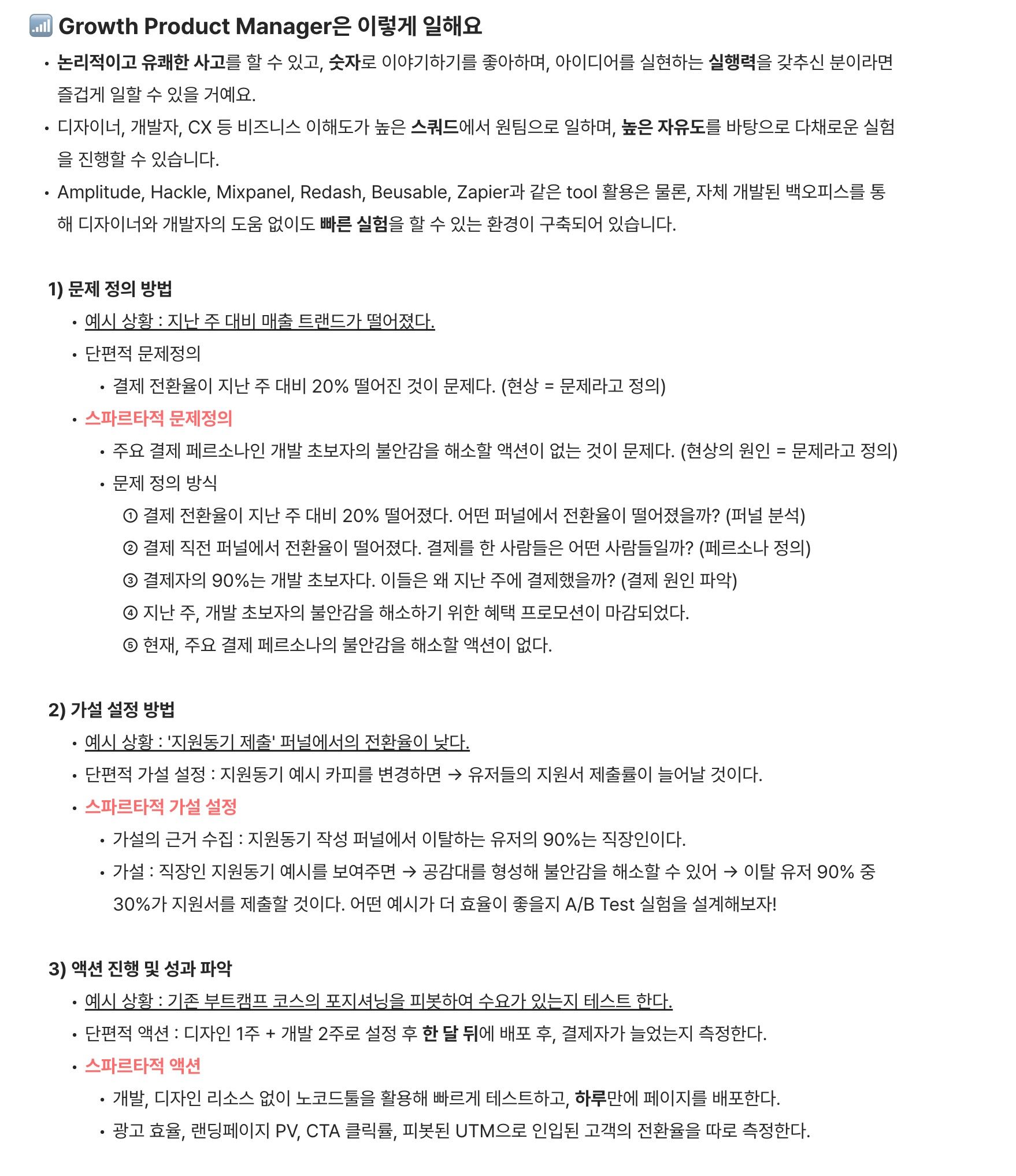 이 공고는 단순한 ‘채용 요건’이 아니라, Growth Product Manager라는 직무가 어떤 사고방식으로 일하고, 어떤 문제를 다루고, 어떤 기준으로 판단하는지를 보여주는 실전 가이드에 가깝다. 문제를 분석하고, 가설을 세우고, 실험을 설계하고, 데이터로 검증하고, 실패해도 배운다. 이 사이클을 빠르고 치밀하게 반복할 수 있는 사람, 그게 바로 성장 중심 PM이라는 것을 공부하기 좋은 공고이다.